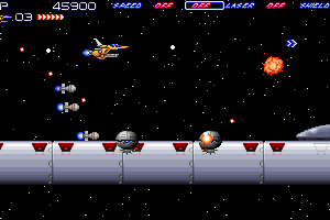 Most levels are set in space, although there are some surprises and a good diversity: in the first level, for example, you face no enemies but must navigate through the asteroid field. There are few bonus items to collect, but there is a good range of weapons you can "buy" at the end of each level with points, which you gain by destroying enemy ships. There is also a 2-player mode, although both players must take turns instead of flying ships simultaneously. Strangely enough, the game offers no joystick support.