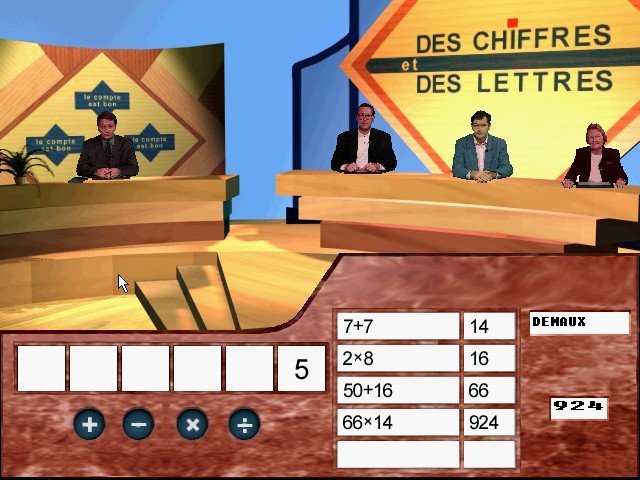 Here is the video game “Des Chiffres et des Lettres”! Released in 1997 on Windows, it's still available and playable with some tinkering. It's an educational and puzzle game, set in a game show / trivia / quiz, math / logic, licensed title and full motion video themes and it was released on Windows 3.x as well.