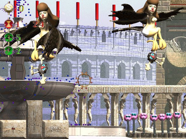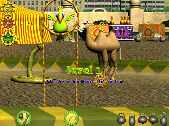 Here is the video game “Die Rache der Sumpfhühner 3”! Released in 2001 on Windows, it's still available and playable with some tinkering. It's an action game, set in an arcade and comedy themes.