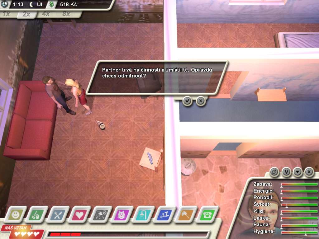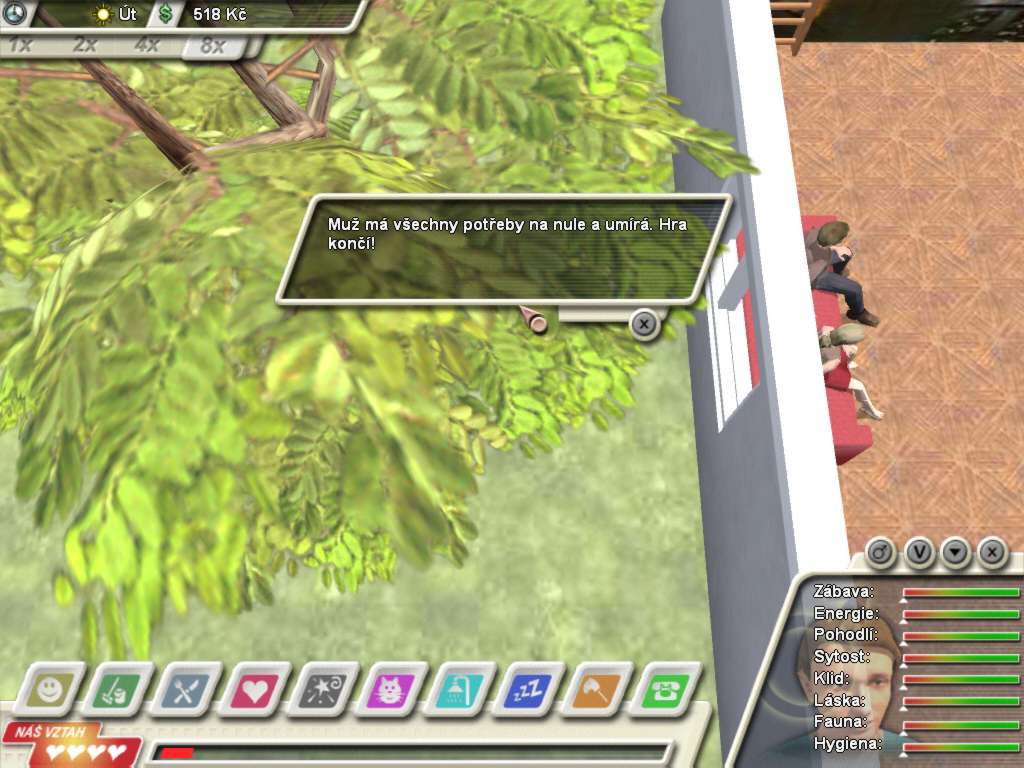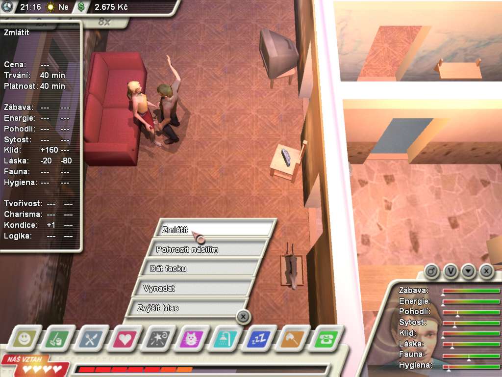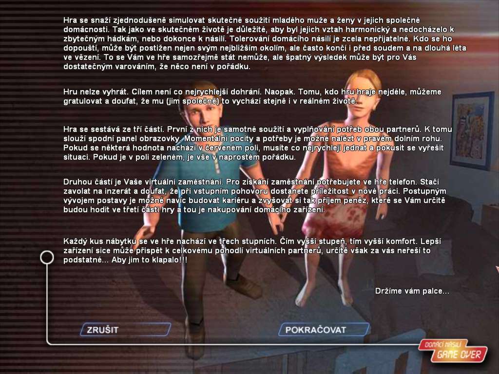 Here is the video game “Domácí násilí: Game over”! Released in 2003 on Windows, it's still available and playable with some tinkering. It's an educational and simulation game, set in a real-time and life / social simulation themes.