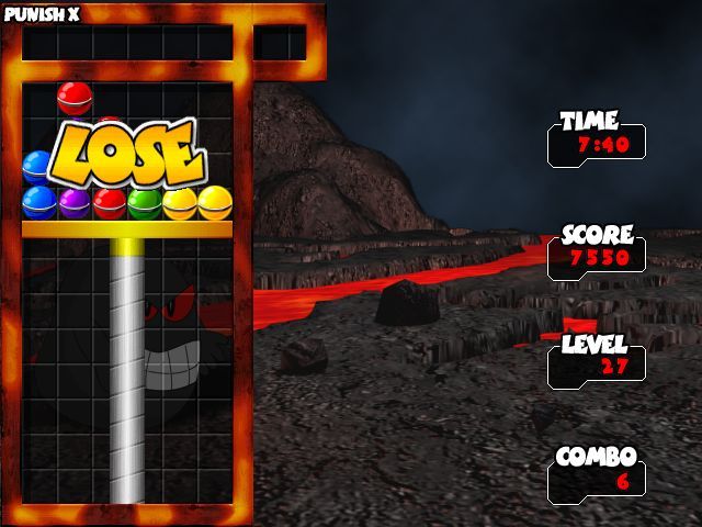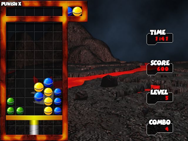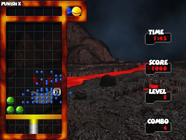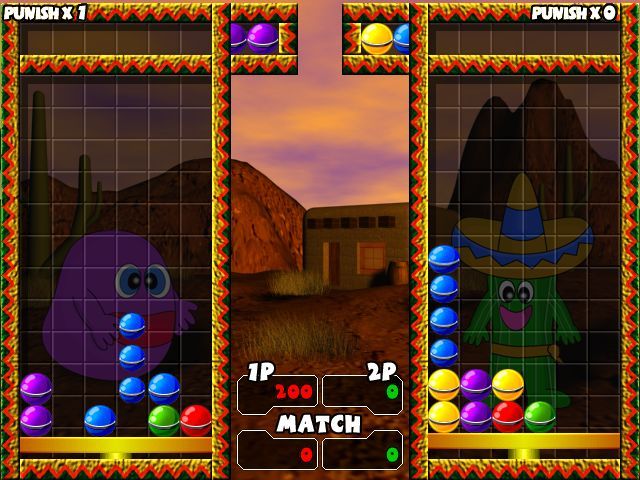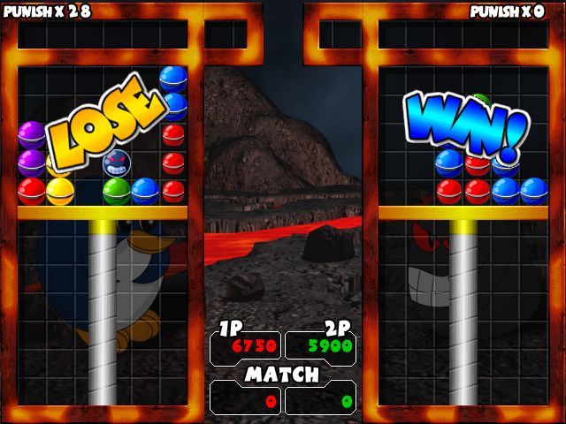 Here is the video game “Drop and Blow”! Released in 2006 on Windows, it's still available and playable with some tinkering. It's a puzzle game, set in a real-time and falling block puzzle themes.