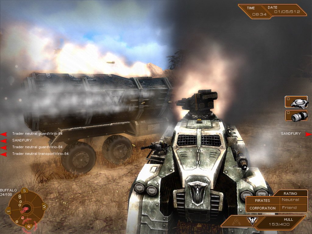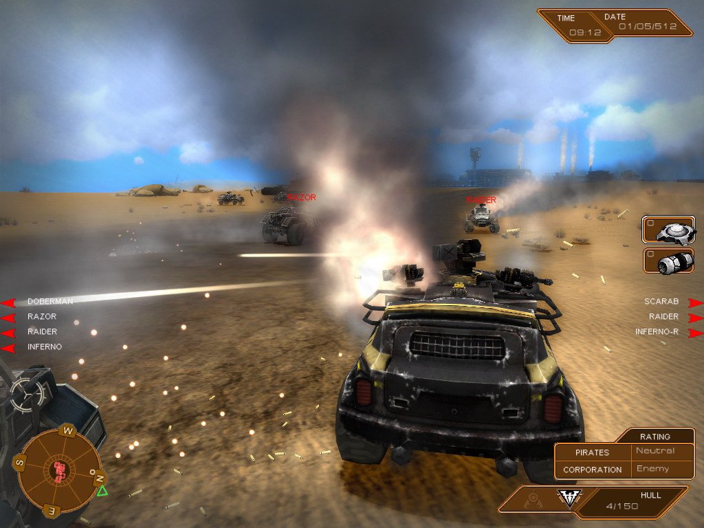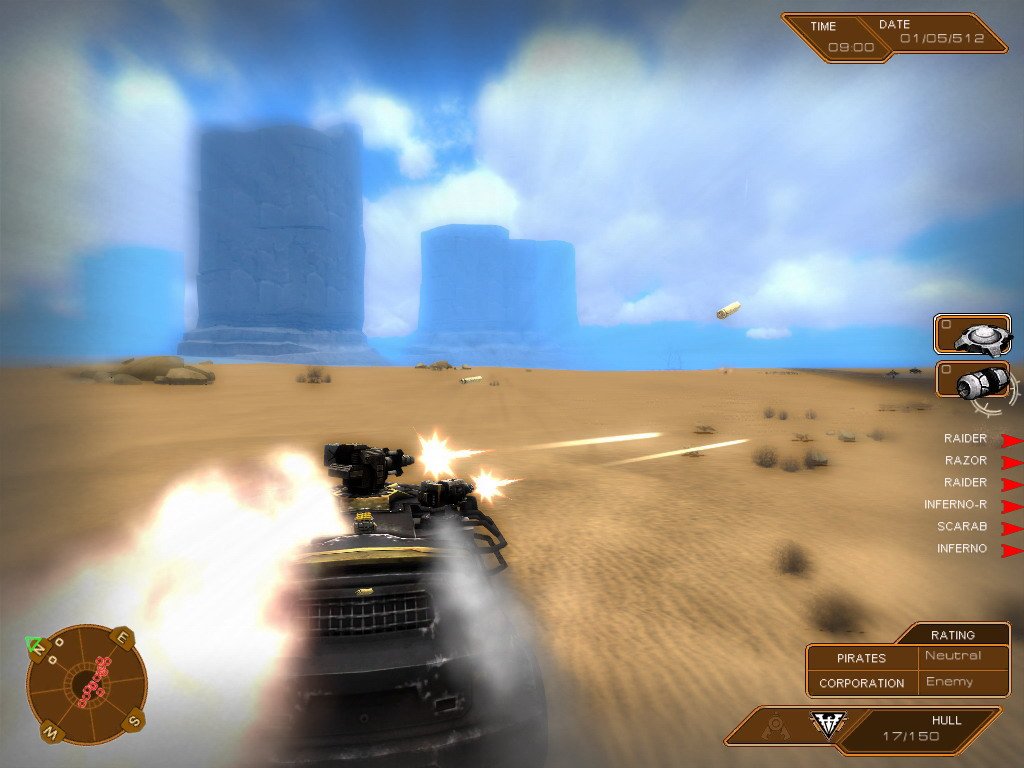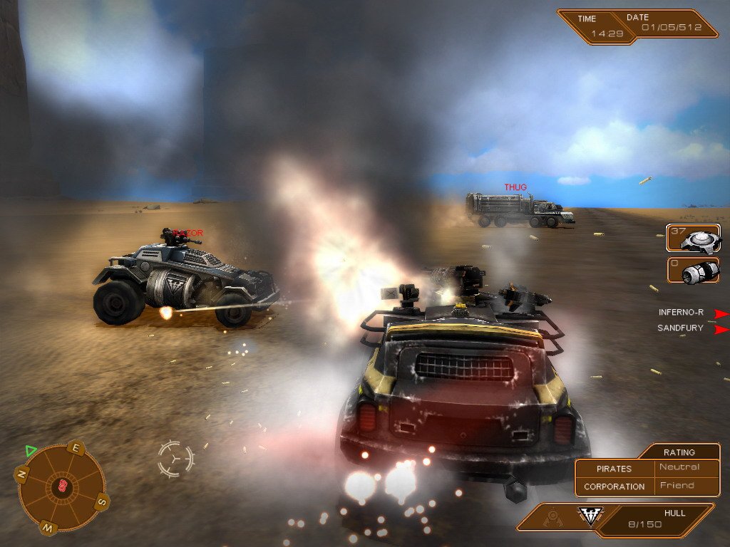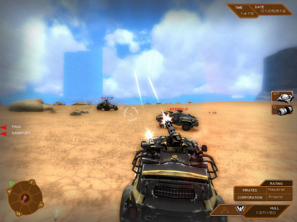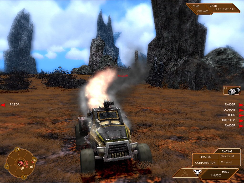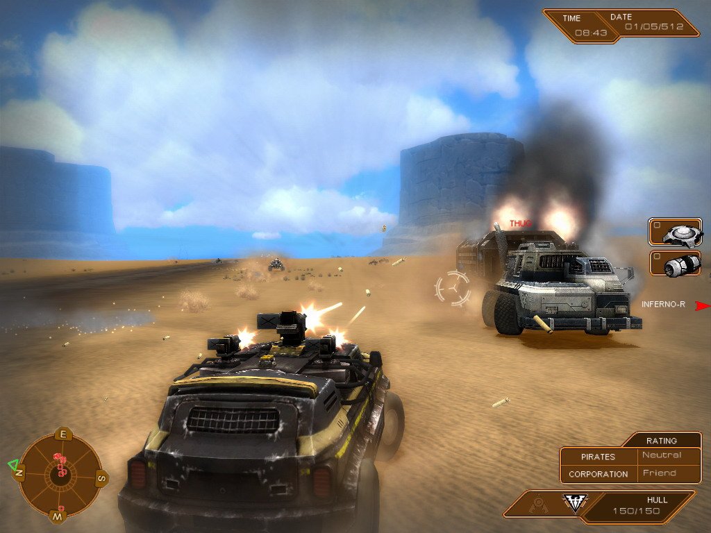 Here is the video game “E.L.I.T.E. Corp.”! Released in 2007 on Windows, it's still available and playable with some tinkering. It's an action and racing / driving game, set in an off-road / monster truck, sci-fi / futuristic, shooter, vehicular combat simulator, automobile and combat vehicules themes.