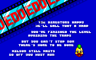 The annoying Edd the duck from the BBC's broom cupboard kids output of the late 80's makes his debut,with a lacklustre paint by numbers platformer,set in a pseudo film set,the enemies that stand in your way can't be killed only frozen,the Wilson the butler hand is looming at the top right corner as you jump about trying to make the platforms,but poor little Edd can only do so much,a horizontal only snowball shooter is all he has,no vertical one,the unforgiving fishes/teddies that fly left to right or suddenly appear from above stun him with pixel accuracy,and his efforts are cast to the 4 winds each time you think you're safe on a ledge just out of reach of the bad guys.