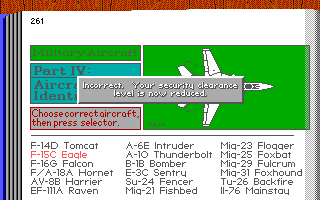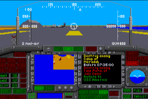 The more or less average sequel to F-19 Stealth Fighter. From MobyGames description: "take America's premiere stealth fighter out for a spin in several battle areas, including the Persian Gulf, Cuba, and even Vietnam. There are various scenarios for each, with air-to-air or ground missions, in "cold war" and full-scale war situations. Players can build up their pilot ranks through completed missions and medals." F-117A is a solid sim overall, but doesn't really stand out from the crowd. It's fun initially, but the missions soon become repetitive, and there is little variation in terrain or sky graphics to hold your attention. The night missions in particular are more tedious than fun, as you will have to strain your eyes to make out objects in the dark, radar notwithstanding.