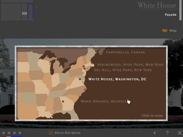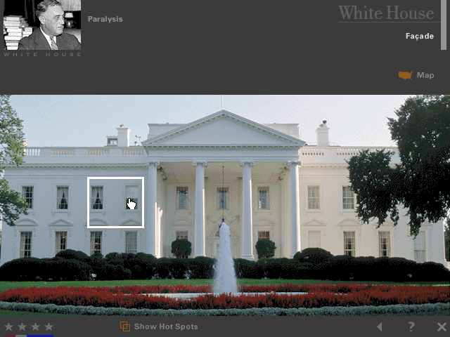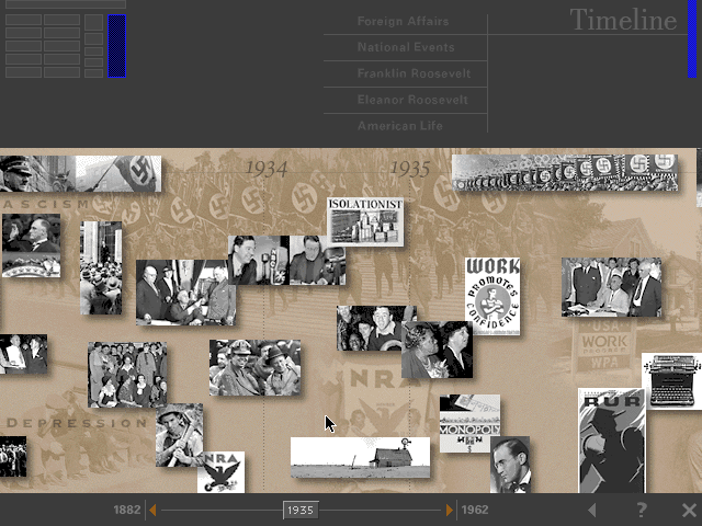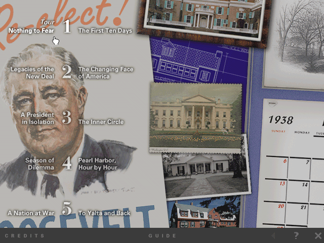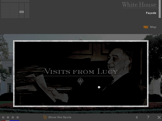 Here is the video game “FDR”! Released in 1996 on Windows, it's still available and playable with some tinkering. It's an educational game, set in a history and interactive cd-rom themes and it was released on Windows 3.x and Mac as well.