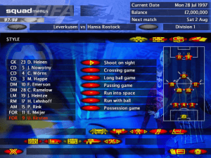Running your team in FSM is quite detailed. The first menu is the Squad menu, where you prepare your team. You can decide on team level tactics, like all out attack or time wasting or even change defense, midfield and attack "zones", and individual tactics, like whether to concentrate on passes, long balls, running into open spaces, shooting on sight and others. You can even give biases to your players, for example biasing your star striker into dribbling the ball more, or telling your tough central defender to rush more into tackles. In here you also buy and sell players, decide on training, get graph analysis of your team's performance, and get detailed reports on each of your players.