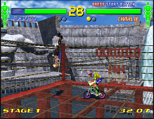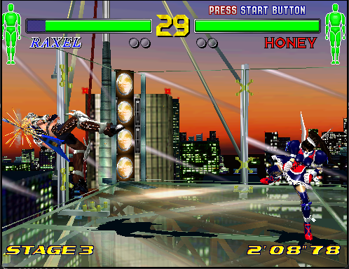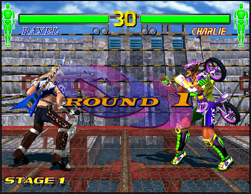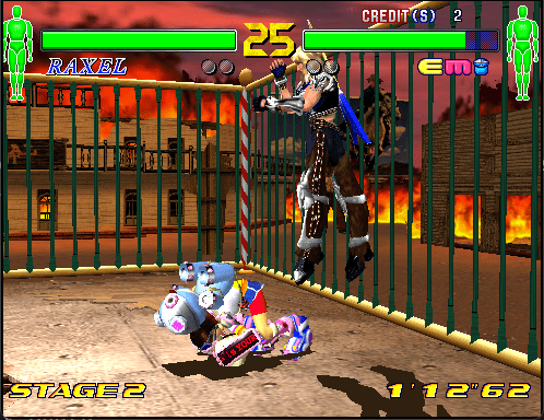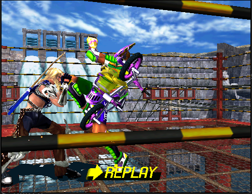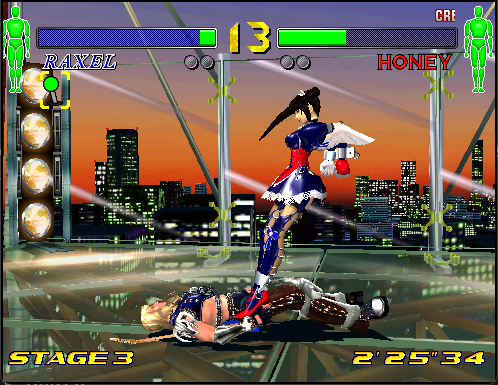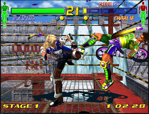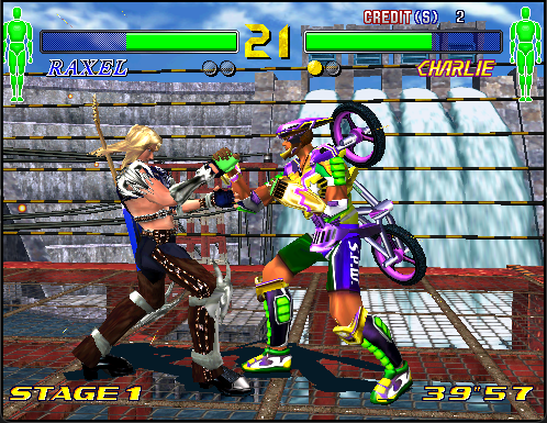 Here is the video game “Fighting Vipers 2”! Released in 1998 on Arcade, it's still available and playable with some tinkering. It's an action game, set in a fighting theme.