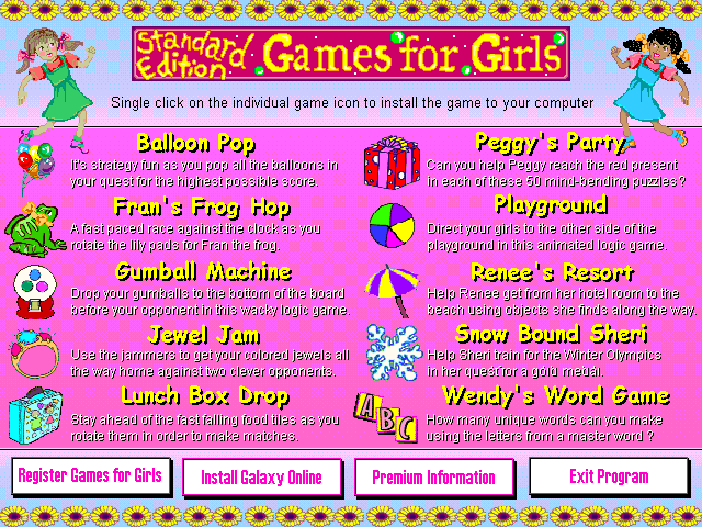 Games For Girls is a compilation of games for Windows 95/98 released by Galaxy Software/eGames in 1998. It includes the next games: Balloon Pop, Fran's Frog Hop, Gumball Machine, Jewel Jam, Lunch Box Drop, Peggy's Party, Playground, Renee's Resort, Snow Bound Sheri, Wendy's Word Game
