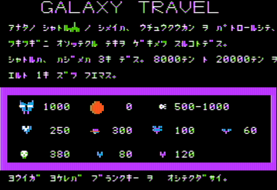 Galaxy Travel is a video game published in 1980 on Apple II by Tukumo Original Soft. It's an action game, set in an arcade and sci-fi / futuristic themes.