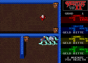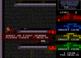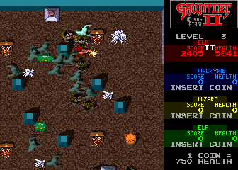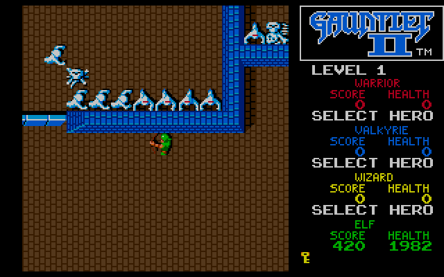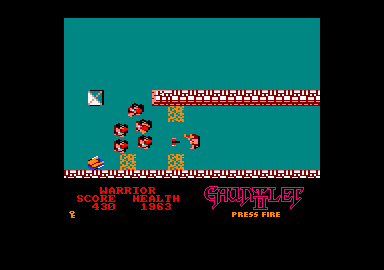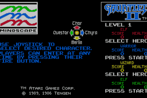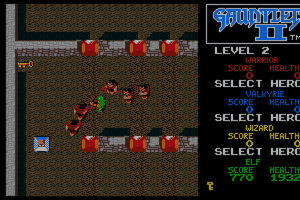 MobyGames description of this excellent sequel to Gauntlet: "Based on the arcade game, Gauntlet II is very similar to the original. Up to four players (a wizard, a warrior, an elf, and a valkyre) make their way through various mazes, collect treasures and magic potions, and fend off assorted creatures and ghosts."