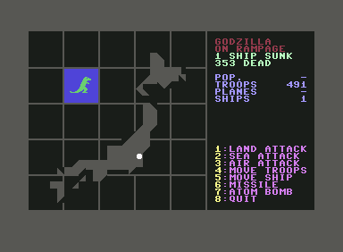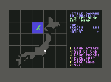 In 1983, Code Works, The publishes Godzilla! on Commodore 64. This strategy and simulation game is now abandonware and is set in a horror, turn-based, licensed title, japan (ancient/classical/medieval), giant monsters and movies themes.