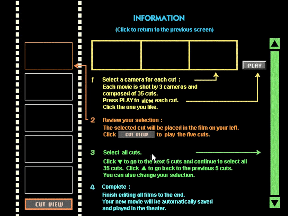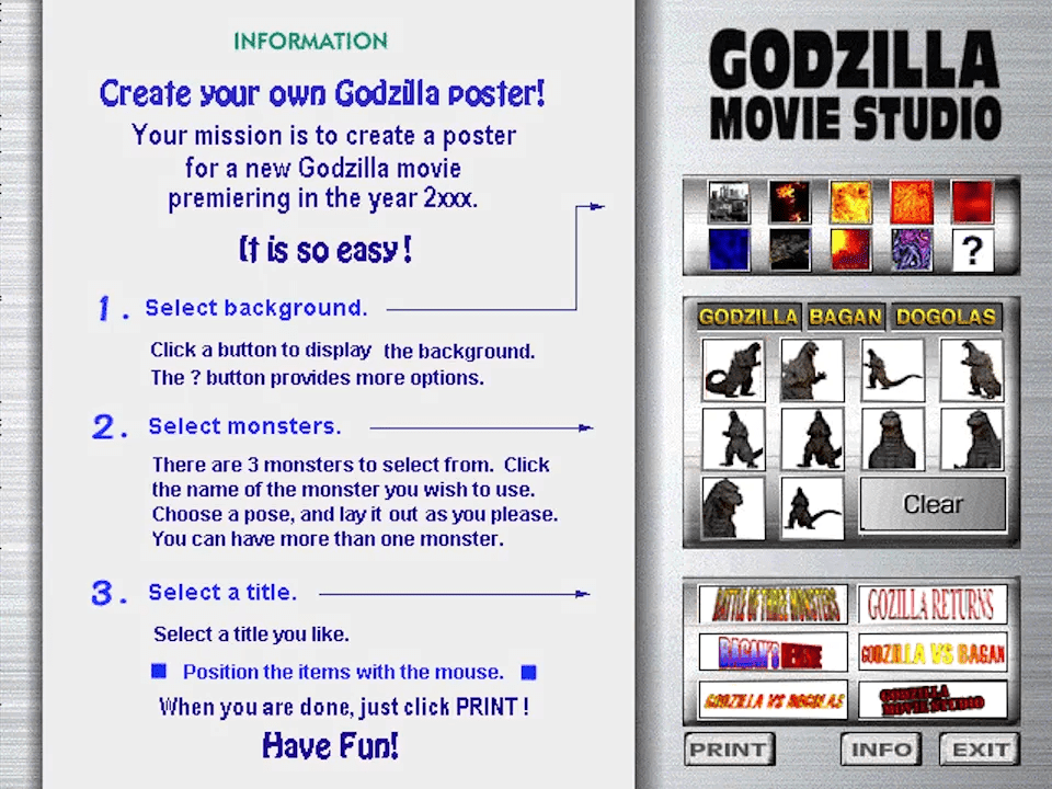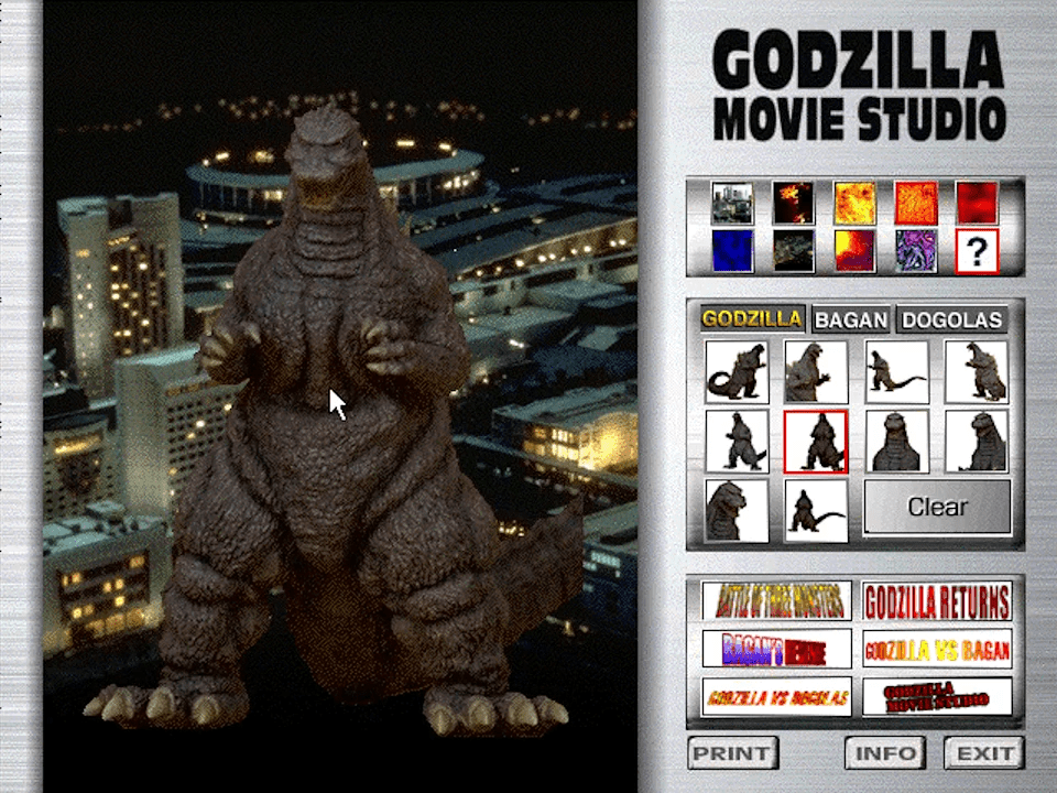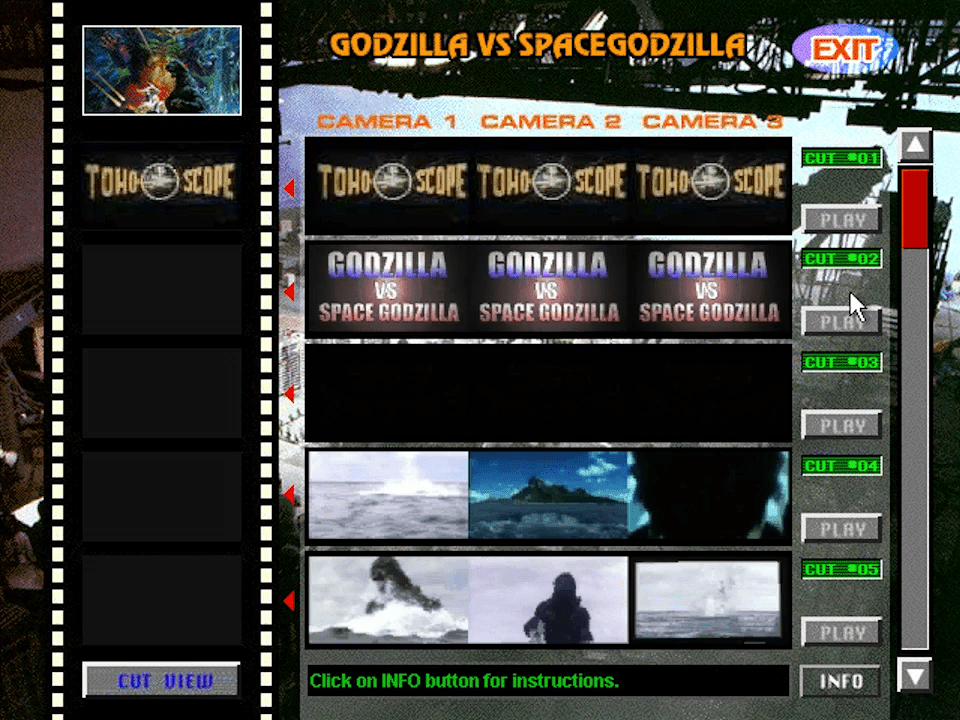 Godzilla Movie Studio Tour was an interactive CD-ROM with a database on information about the Godzilla franchise. In addition to that information, the players could also take a virtual tour around the movie studio and create a custom movie by combining 35 different cuts. Check this page for more details about that CD-ROM