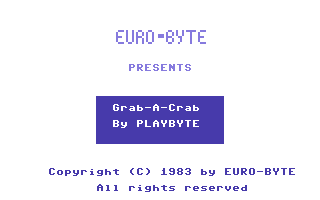 1983, the year Grab-A-Crab was released on Commodore 64. Made by Playbyte and published by Euro-Byte Ltd, this action game is available for free on this page.