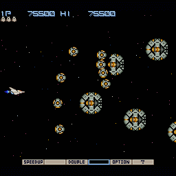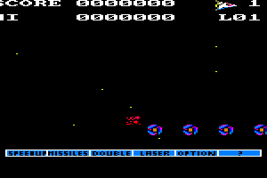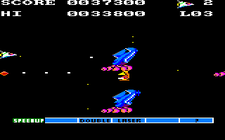 Gradius is a video game published in 1987 on Commodore 64 by Ocean Software Ltd., Konami Ltd.. It's an action game, set in an arcade, sci-fi / futuristic, shooter, shmup and space flight themes, and was also released on Amstrad CPC, MSX, PC-88, Sharp X68000 and TurboGrafx-16.