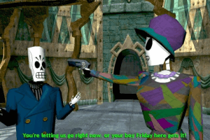 Manny Calavera, salesman for the Department of Death, hasn't been able to get a client in months that is eligible for a ticket on the Number Nine, the train that takes souls across The Land of the Dead, through Rubacava into the Afterlife. Manny can't seem to sell any better package than a walking stick to help souls in their journey. Fellow salesman Domino seems to be getting these premium clients at an ungodly rate. Meche Colemar, a sweet harmless woman, walks into Manny's office. She has a flawless record and is guaranteed a ticket on the Number Nine. Unfortunately, she only qualifies for the lowest package available. Manny has a suspicion that something is desperately wrong in the department and when he starts asking questions he is promptly fired from his job. Meche leaves the Land of the Dead to go on her trip and Manny and his pal (and comic relief of the game) Glottis go on a four year journey of heartache, hope, and self- discovery. Grim Fandango is a trademark LucasArts adventure and simply one of the top five adventures ever created. Behind the game is a beautifully told story with witty and downright funny dialogues that you'll be quoting for days on end. Dare I say that some lines are as memorable as the classic lines from the classic films of the Film Noir genre. Grim is essentially a computer game tribute to Film Noir. Pop culture references abound paying tribute to everything from Casablanca to Hitchcock to Bogart. You'll be snapping your fingers for days after you hear the phenomenal swing-jazz soundtrack that echoes the influences of Count Basie, Glen Miller, and Duke Ellington. But any LucasArts game wouldn't be a LucasArts game without well designed characters and an easy to use interface. Manny, Meche, Glottis and their cohorts in the 3D gameworld are convincingly acted and realized. There is a depth and breadth to the characters seen in few games before or since. Tony Plana (the voice of Manny) and his fellow voice over actors present us with great voice acting without sounding forced or over-the-top.