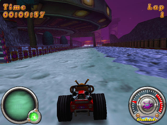 Here is the video game “Gubble Buggy Racer”! Released in 2001 on Windows, it's still available and playable with some tinkering. It's a racing / driving game, set in an arcade, fantasy, automobile, track racing and combat vehicules themes.