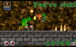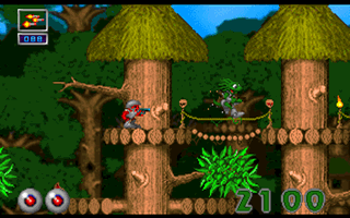 Along the way to battle Nectarion, you will have to blast various monsters with your trusty gun, and negotiate various obstacles including fireballs, moving platforms, and other devious traps. There are many kinds of power-ups in the game, and level designs are full of interesting motifs and details background graphics. There are also optional routes you can take through the game, much like SEGA's Sonic series, as well as a decent share of secret paths. There are 10 weapons to find and use in the game, and hunting the enemies in the dense jungle is one of the game's highlights.