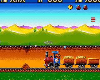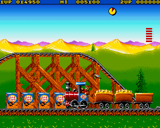 As a small cartoon bear, your job is to collect bags of popcorn with the cargo train. Since some bags lay off the default railroad, you need to flip switches that lie along the route to change tracks. The trick is you cannot manipulate the switches yourself, but must press the SPACEBAR to make the little bee who normally follows your train to flip the switches for you. The game starts off quite easy, but gets difficult later on, as the time limit gets shorter but you have more popcorn bags to collect, and they lie on crooked, hard-to-navigate routes.