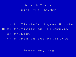 In 1985, Mirrorsoft Ltd. publishes Here and There with the Mr. Men on MSX. Also published on Amstrad CPC and ZX Spectrum, this educational game is abandonware and is set in a pre-school / toddler, licensed title and mini-games themes.