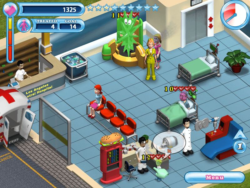 Here is the video game “Hospital Hustle”! Released in 2008 on Windows, it's still available and playable with some tinkering. It's an action and simulation game, set in an arcade and time management themes.