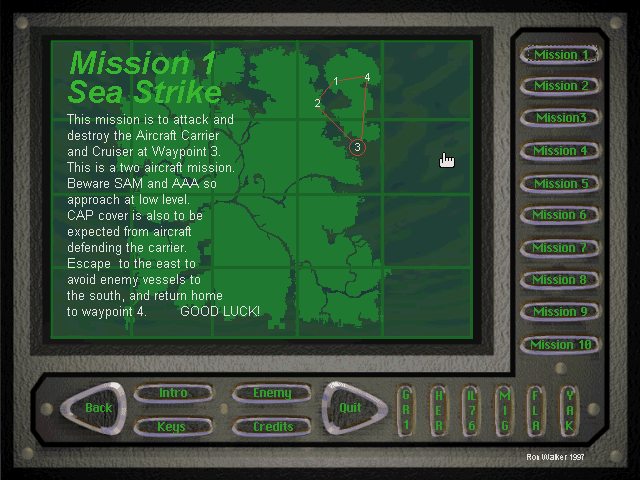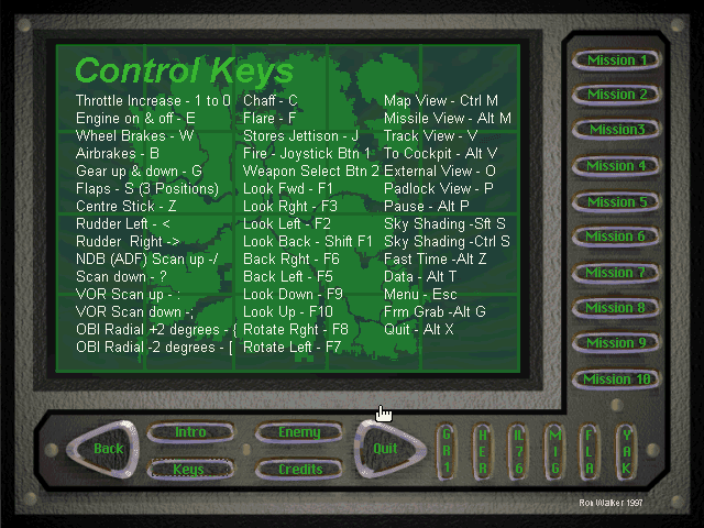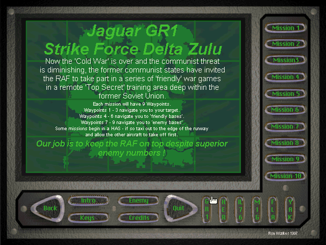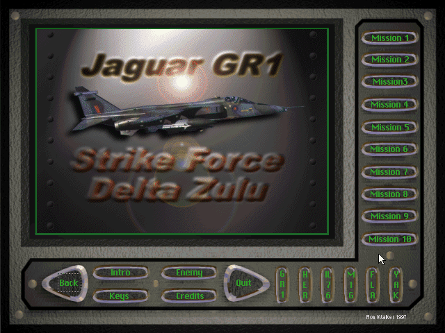 1997, the year Jaguar GR1: Strike Force Delta Zulu was released on DOS. Made and self published by Ron Walker, this simulation game is available for free on this page.