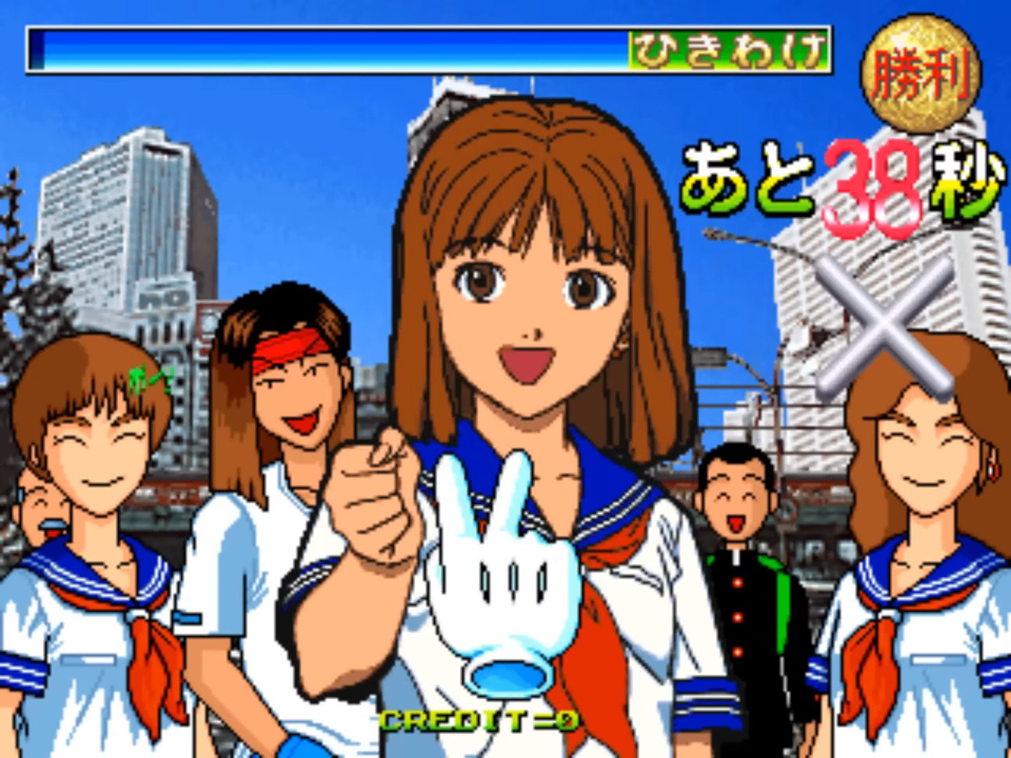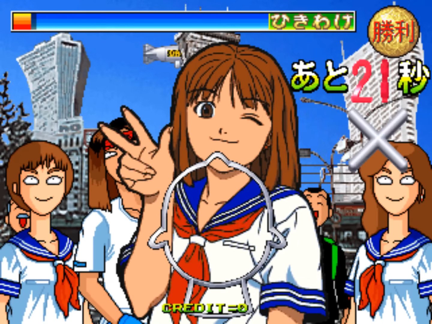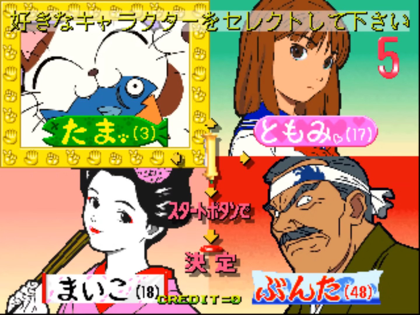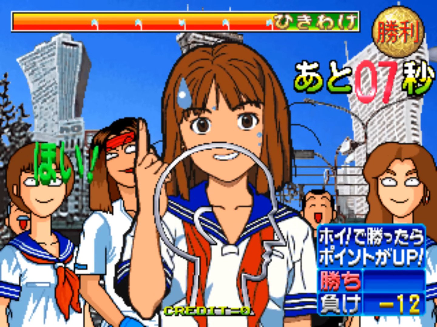 Janken Game Acchi Muite Hoi! (aka ジャンケンゲームあっちむいてホイ!) is a video game published in 1996 on Arcade by Data East Corporation. It's an action game, set in an anime / manga theme.