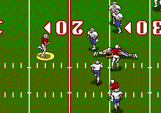 Here is the video game “Joe Montana II: Sports Talk Football”! Released in 1991 on Genesis, it's still available and playable with some tinkering. It's a sports game, set in a football (american) and licensed title themes.