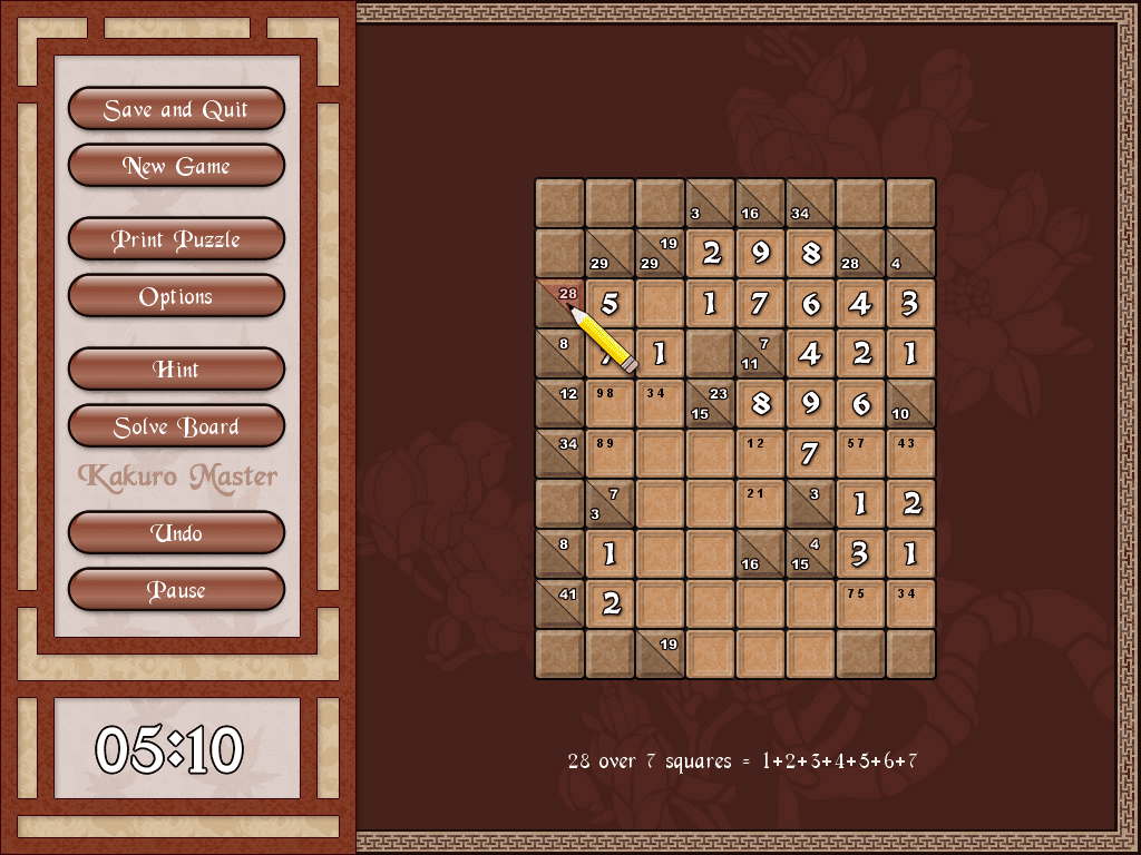 Kakuro Master (aka Kakuro Puzzle Addict: Unlimited Edition, Infinite Kakuro) is a video game published in 2005 on Windows by InertiaSoft Ltd.. It's a puzzle game, set in a board / party game theme.