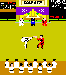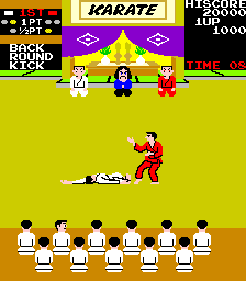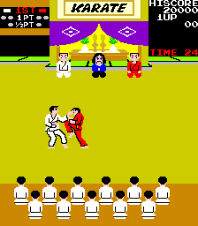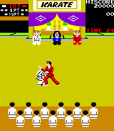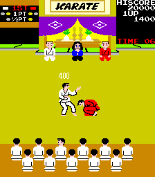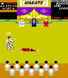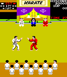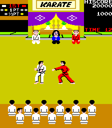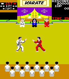 Here is the video game “Karate Champ”! Released in 1985 on Commodore 64, it's still available and playable with some tinkering. It's an action game, set in an arcade, fighting, martial arts and versus fighting themes and it was released on Apple II and Arcade as well.