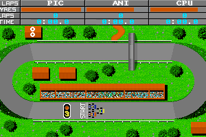Here is the video game “Karting Grand Prix”! Released in 1988 on DOS, it's still available and playable with some tinkering. It's a racing / driving game, set in an arcade, automobile and track racing themes and it was released on Amiga and Commodore 64 as well.