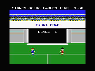 Here is the video game “Konami's Soccer”! Released in 1985 on MSX, it's still available and playable with some tinkering. It's a sports game, set in a soccer / football (european) theme.