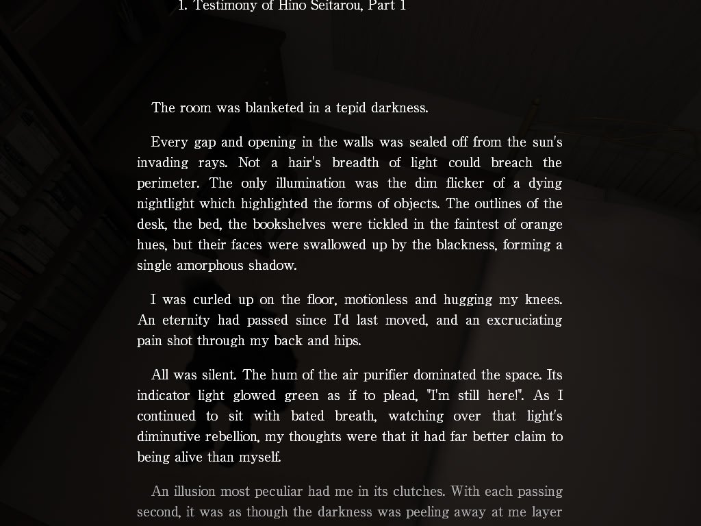 If you haven't played Kurai Heya or want to try this adventure video game, download it now for free! Published in 2010 by Kurai Heya Seisaku Iinkai, Kurai Heya (aka 暗い部屋, The Dark Room, 暗之部屋, An zhi Buwu) was an above-average visual novel title in its time.