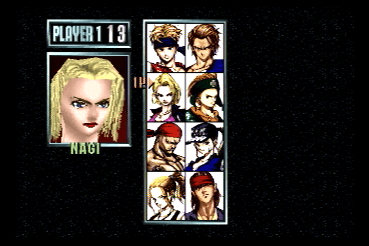 There are several ways that you can play Last Bronx. There's 'Arcade Mode', which is just the same as the Saturn version of the game, or 'PC mode', which has you taking on the baddies in a specific order, corresponding to the character you choose. Complete the game in this mode, and you get an Anime style end-sequence, showing the ultimate fate of your character. Or you can opt for 'Survival Mode', where you take on all the characters, without ever getting your energy bar replenished. Then there's 'Training Mode' which lets you learn specific combo attacks. Or you can pick a team of fighters and take on the computer fighters. Finally, there's two player mode, where you can virtually humiliate someone in one-on-one combat.