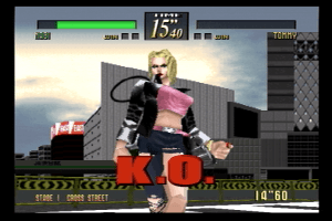 If the game play is a bit stale the graphics are definitely heading towards the next generation of realism. Virtua Fighter introduced those floating polygon fighters with the chisled features. Last Bronx's fighters are much more defined with shadows, clothing details and more facial expressions. The settings are also much more detailed and depict actual Toyko locations. Along with the typical cracks and smacks of the fight, graphic elements have been added to the fight. Impacts of weapons on flesh are signaled by bright flashes while the weapons' arcs are traced by strobe-light like highlight effects as the weapons slice through the air.
