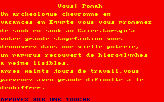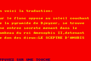1985, the year Le Sceptre d'Anubis was released on Amstrad CPC. Published by Micro Programmes 5, this adventure game is available for free on this page.