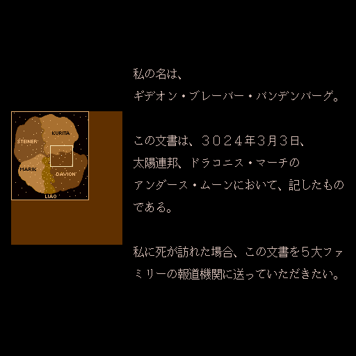 In this game, you play a young man whose reputation has been soiled by an evil usurper. You have five years to build a force of giant robots and great pilots strong enough to attack your foe. Take on mercenary missions for any one of the 5 houses from the first generation world of FASA's BattleTech (Kurita, Davion, Steiner, Marik, Laio). The missions themselves take place from first-person perspective, in 3D-rendered worlds, where you pilot your robot, fighting other robots of the same ilk.