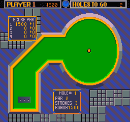Here is the video game “Mini Golf”! Released in 1987 on Commodore 64, it's still available and playable with some tinkering. It's a sports game, set in a golf theme and it was released on Arcade as well.