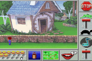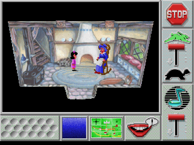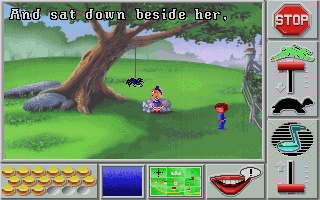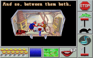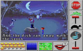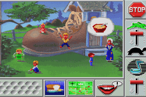 The game is a giant map of multiple houses/buildings/scenes where numerous classic Mother Goose characters are hanging out. Each one is missing something essential: Peter Pumpkin Eater can't find his wife, or Mary lost her little lamb. After the character's poetic speech, it flashes the exact picture of the missing object (that's why pre-readers can play this.) Since each scene is just the character or the object its easy to match them up, however, a little mind can get lost in the map very easily. Also, you can only carry one object at a time, whenever you pick one up it will set down whatever you had last.