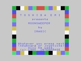 Moonsweeper is a video game published in 1983 on Atari 2600 by Imagic, Activision, Inc.. It's an action game, set in an arcade, sci-fi / futuristic, shooter and space flight themes, and was also released on ColecoVision, Commodore 64, MSX and ZX Spectrum.
