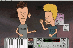 Now this is a novelty. For one thing, it's not a game, it's a device for expressing your creativity. Don't go thinking this should be in the Kids Domain though. Air Guitar easily manages to retain Beavis and Butt-head's erm unique style. At the left hand side of the screen there is a single octave piano keyboard. Clicking a key will play the appropriate note through your sound card. If this arrangement doesn't allow your artistry full rein, there is also a keyboard interface. At the right hand side of the screen are the usual selection of tape deck buttons with which to record and save your masterpiece. Finally, in the centre are the instrument buttons which offer a range of three effects, air guitar, burp and fart. There is an undeniable attraction in having the boys fart 'somewhere over the rainbow' for the edification of your peers but alas, it seems like you can only record 15 seconds of your masterpiece, hardly enough to get into the first chorus.