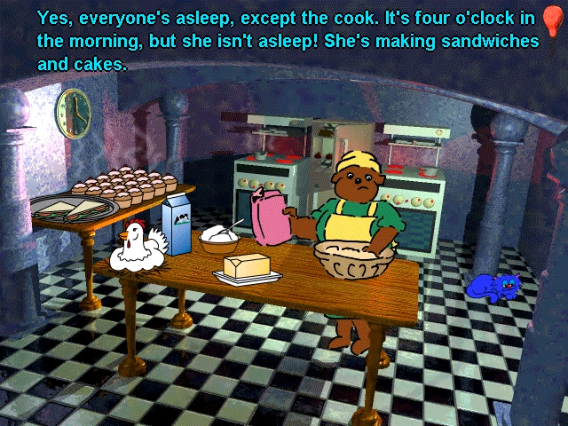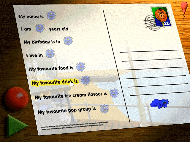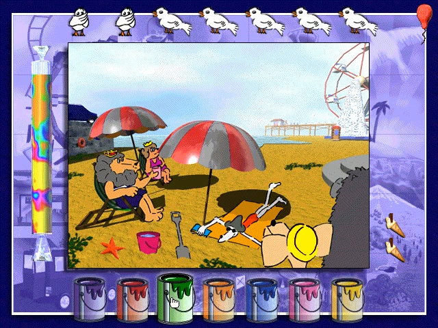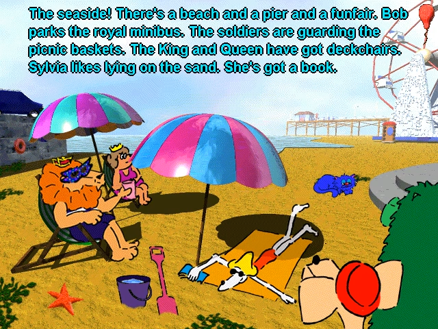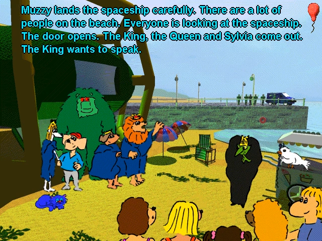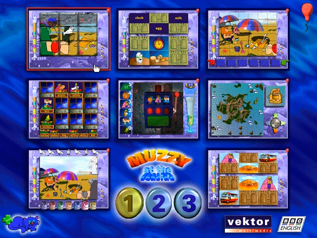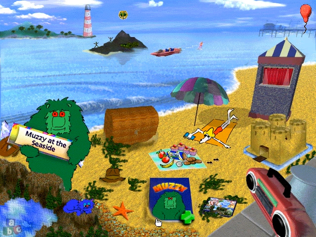 In 1997, BBC Multimedia publishes Muzzy at the Seaside on Windows. Also published on Mac, this educational game is abandonware and is set in a foreign language, reading / writing and interactive book themes.