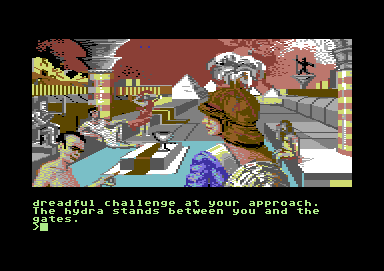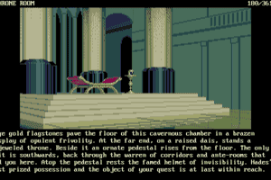 Myth is a rather short game. Oddly, it only has four (4) graphic pictures even though it has about 24-28 rooms. Each graphic picture shares 6-7 rooms/locations. In the upper left corner is the name of the room-so 001 is "Beside The River Styx" and the next screenshot (same picture) is "Wooden Jetty". The last few shots were my attempt to capture the end game text as it scrolled by under the throne room graphic.