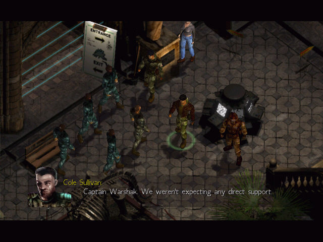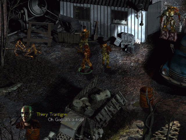 Adventuring is very straightforward. You have three team members that travel in a group. (No, you can't split up the team.) As you explore the city you'll encounter up to three different types of event triggers. One type of trigger you'll encounter is interacting with characters. Essentially, the dialogue advances the game's plotline, and sometimes characters may even offer to join your team briefly. These dialogue triggers are linear and are set off by predetermined events during the game. The second type of trigger can only be described as an access trigger. These access triggers can be as simple as a box on the map that you click on to open in order to gain access to equipment stores, which you can salvage for your team. Since the game is broken up into stages, other access triggers open up new areas in the city for you to explore. These can only be activated by certain items that are collected along the way. Finally, the most common triggers are combat encounters, where you fight enemies, be they humans or creatures.