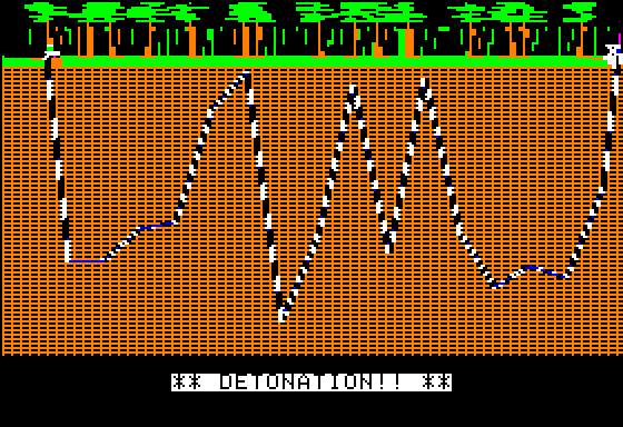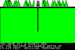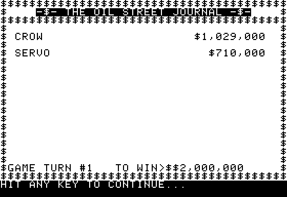 Included with the game is a game board with a 50x40 grid of the landscapes you can drill in, and dozens of game pieces to keep track of which locations belong to a player and where oil has (or has not) been discovered. This makes Oil Barons resemble a board game, but with a computer to do the bookkeeping and add a random element instead of dice."