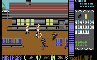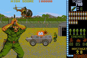 Gameplay is standard click-to-shoot, but what makes Operation Wolf fun is that there are many types of enemies to shoot at, all of whom animated realistically. You will see infantrymen rolled from side to side to evade your fire before lobbing grenades at you; tanks lumber along and aim their deadly gun barrel at you; helicopters that hover too low can be shot down; et cetera. There are many ammo types and grenades to collect and use, as well as necessities such as first aid kits that restore your health.