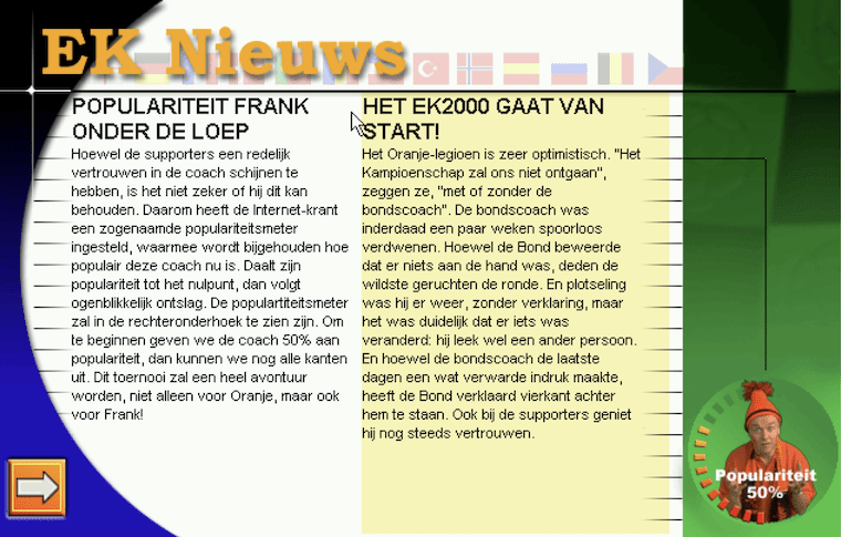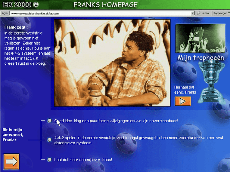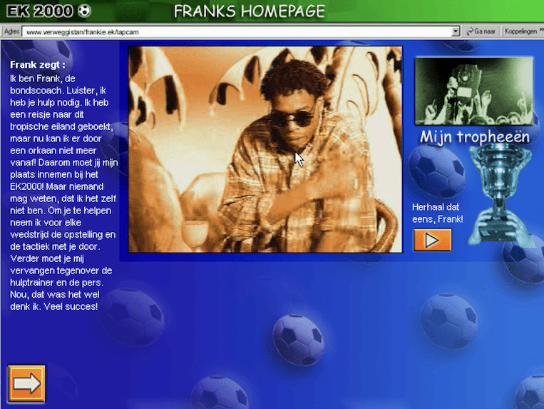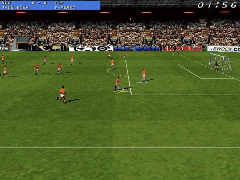 Here is the video game “Oranje Eurokampioen 2000”! Released in 2000 on Windows, it's still available and playable with some tinkering. It's an action and sports game, set in a managerial and soccer / football (european) themes.