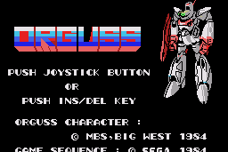 Here is the video game “Orguss”! Released in 1984 on SG-1000, it's still available and playable with some tinkering. It's an action game, set in an anime / manga, arcade, battlemech, sci-fi / futuristic, shooter and licensed title themes.