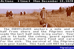 A small educational game similar to Brøderbund's Galleons of Glory in concept if not the era, Pilgrim's Quest puts you on the legendary Mayflower as she sails for the New World. Contend with problems real pilgrims faced, from diseases to incremental weather and mutinous crew, and a host of other problems once you land. It's short and easy, but quite enjoyable.