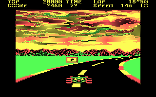 This rare PC version by NAMCO unfortunately won't give you the same feeling as the semi-authentic steering wheel and gas pedal setup of the arcade version, but it nevertheless remains a fun and addictive game. Although naturally the game's 4-color CGA palette pales in comparison to vibrant colors of the arcade version (which you can find to run on MAME emulator by searching the web), many of the game's innovations carry over to the PC version, back when black-and-white wireframe graphics were still the norm.