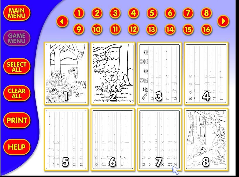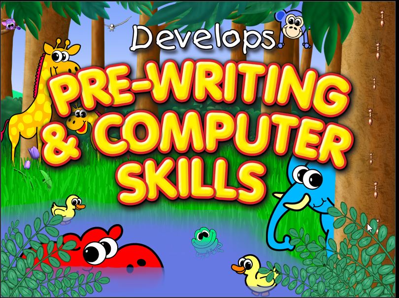 Here is the video game “Pre-Writing & Computer Skills”! Released in 2002 on Windows, it's still available and playable with some tinkering. It's an educational game, set in a reading / writing theme and it was released on Mac as well.